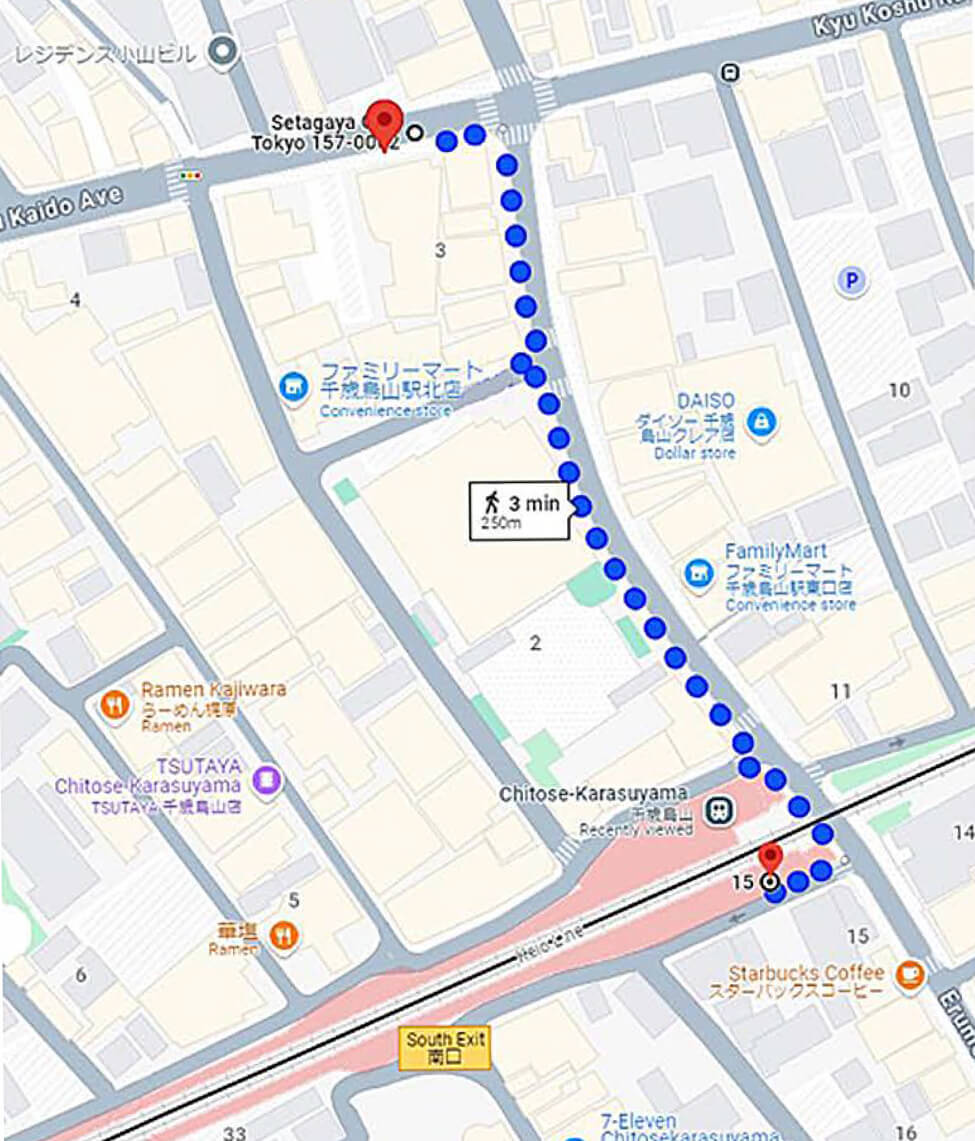 If you don’t take the bus, it takes about 20 minutes to walk from Chitose-Karasuyama Station. Walking route from Chitose-Karasuyama Station.