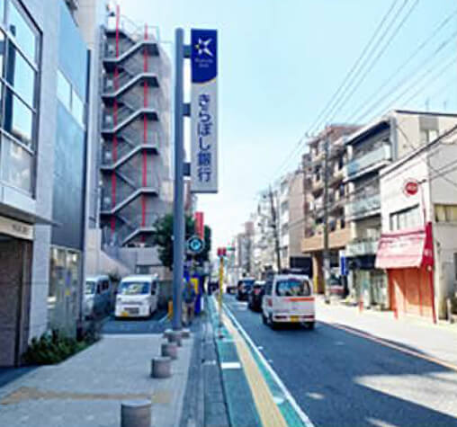 5. After exiting the South Exit ticket gates, go left and immediately cross the railroad crossing. After crossing the railroad crossing, go straight and after two blocks turn left at the Chitose-Karasuyama Station entrance intersection. After 20 m, you will see the Kanto Bus "Chitose-Karasuyama" bus stop in front of Kiraboshi Bank.